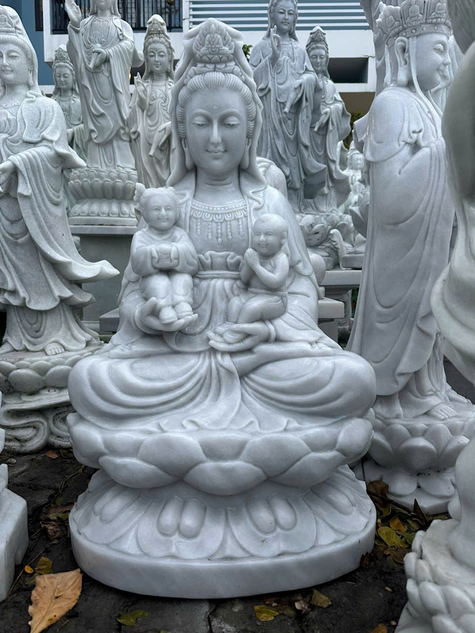 Tượng Quan Âm Tống Tử cao 80cm được chế tác từ đá tự nhiên nguyên khối, tạo hình Quan Thế Âm Bồ Tát ngồi đài sen và bế một hài đồng – biểu tượng linh thiêng trong phong thủy tâm linh. Tượng mang ý nghĩa cầu con, cầu tự, cầu bình an và hạnh phúc cho gia đình.